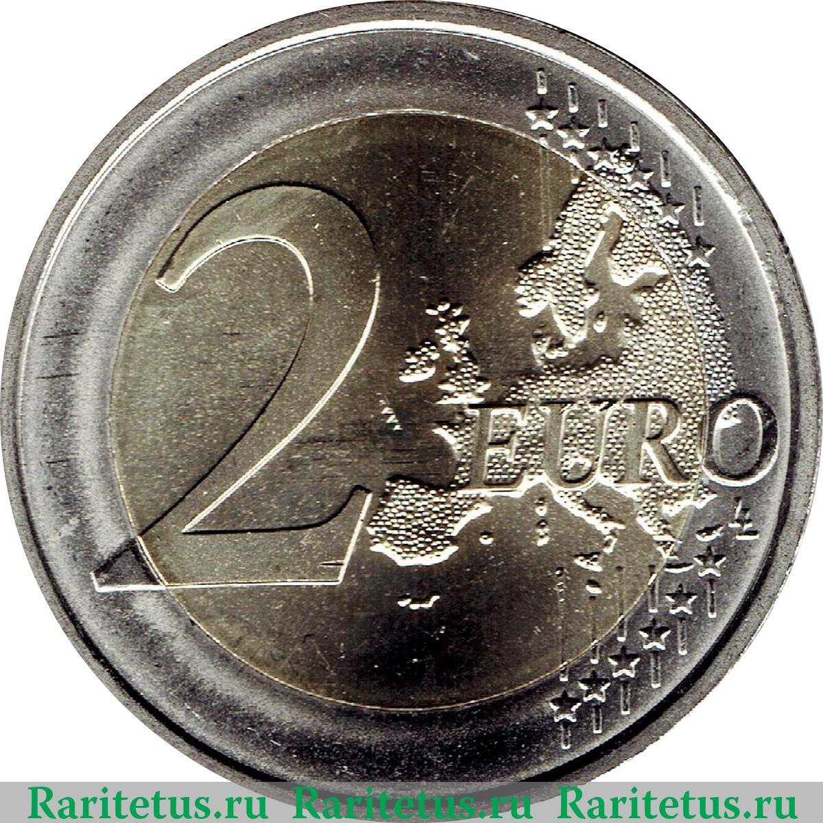 По центру горизонтально надпись на английском языке «2 EURO» (2 евро). Буквенная часть надписи выполнена на фоне карты Европейской части континента. Сверху и снизу карты по шесть линий с пятиконечными звездами. Под литерой «О» перекрещенные инициалы художника Luc Luycx латинские литеры «LL».