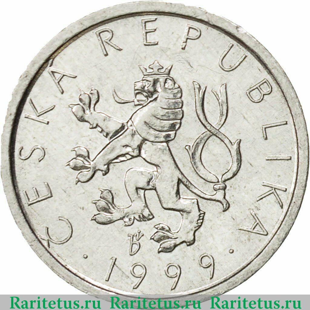 Слева, сверху и справа вдоль канта надпись на чешском языке: "ČESKÁ REPUBLIKA" - "ЧЕШСКАЯ РЕСПУБЛИКА", снизу - год выпуска: "1999". В центре профильное изображение льва с двумя хвостами в профиль - эмблемы Чехии. Снизу - буква: "b" - знак монетного двора Яблонец-над-Нисой.