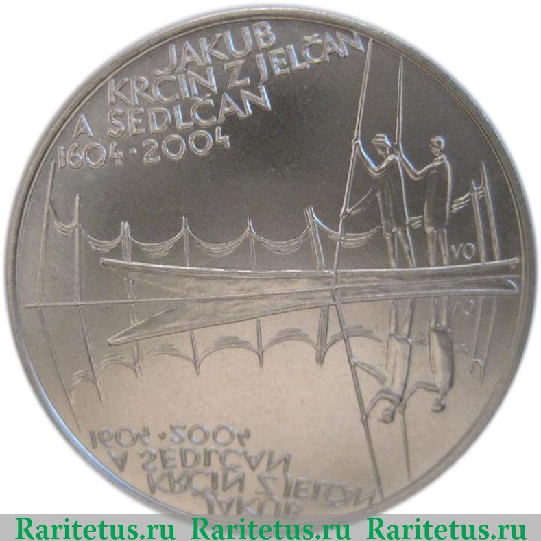 В центре композиция, выполненная в зеркальном отражении: два человека, плывущих на на лодке, держащих в руках шесты. Над ними литера «VO» - знак монетного двора г. Яблонец над Ниссой. Сверху возле канта надпись на чешском языке в 4 строки: «JAKUB KRČÍN Z JELČAN A SEDLČAN 1604-2004» - Якуб Крчина из Елчан и Седлчан, 1604 - 2004.