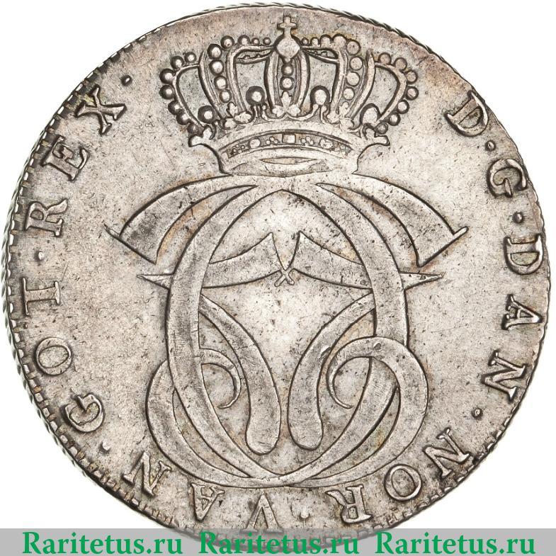 В центре изображена монограмма коронованного короля: сверху корона, под ней буква: "С" и цифра "7" слева направо и точно такая же в зеркальном отражении, что означает: "CHRISTIAN 7" - "КРИСТИАН VII". Справа, снизу и слева вдоль канта надпись на латинском языке: "D.G. DAN.NOR.VAN.GOT.REX" - "БОЖЬЕЙ МИЛОСТЬЮ КОРОЛЬ ДАНИИ, НОРВЕГИИ, ВЕНЕДОВ И ГОТЛАНДА". По краям канта расположены рельефные элементы в виде зубцов.
