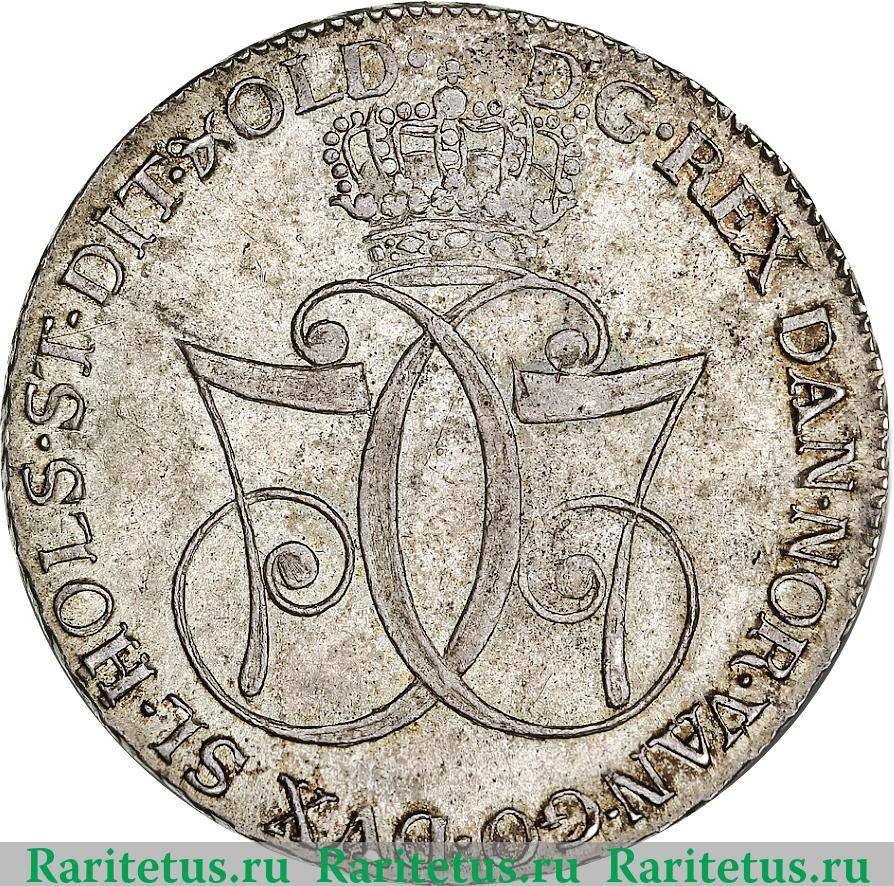 В центре изображена монограмма коронованного короля: сверху корона, под ней буква: "С" и цифра "7" слева направо и точно такая же в зеркальном отражении, что означает: "CHRISTIAN 7" - "КРИСТИАН VII". Справа, снизу и слева вдоль канта надпись на латинском языке: "D G REX DAN NOR VAN GO DVX SL HOLS ST DIT & OLD" - "БОЖЬЕЙ МИЛОСТЬЮ КОРОЛЬ ДАНИИ, НОРВЕГИИ, ВЕНЕДОВ И ГОТЛАНДА, ГЕРЦОГ ШЛЕЗВИГА, ГОЛЬШТЕЙНА, ШТОРМАРНА, ДИТМАРШЕНА И ОЛЬДЕНБУРГА".
