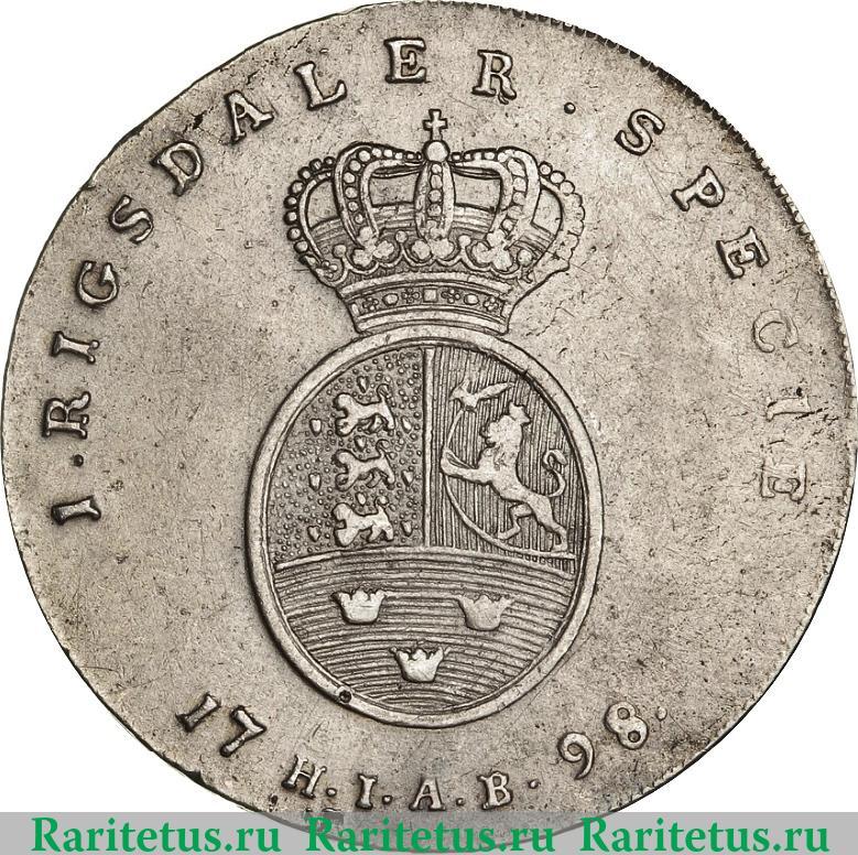 В центре герб страны - щит и корона. Слева, сверху и справа вдоль канта надпись на датском языке: "1 RIGSDALER SPECIE" - "1 СПЕСИЕ РИГСДАЛЕР", снизу - год выпуска: "1798".