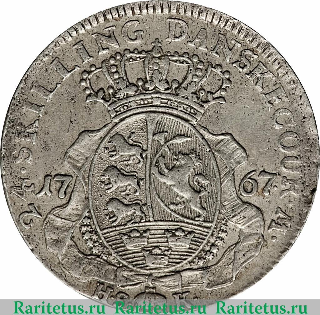Слева, сверху и справа вдоль канта надпись на датск. яз.: "24 SKILLING DANSKE COUR M" - "24 ДАТСКИХ СКИЛЛИНГА КОРОЛЕВСКИЙ МОНЕТНЫЙ ДВОР". В центре - герб страны: корона и щит. Слева и справа от изображения - цифры, вместе образующие год выпуска: "1767". По краям канта расположены рельефные элементы в виде зубцов.