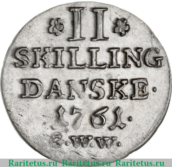 В центре надпись 2 датских скиллинга в 3 строки на дат. яз.: "II SKILLING DANSKE". Слева и справа от римской цифры "II" изображены 2 цветка. Снизу - год выпуска: "1761". По краям канта расположены рельефные элементы в виде зубцов.