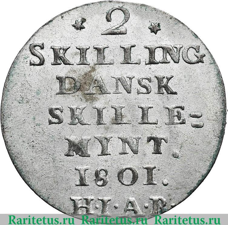 В центре надпись в 6 строк на датском языке: "2 SKILLING DANSK SKILLE MYNT 1801" - "2 ДАТСКИХ СКИЛЛИНГА МОНЕТНЫЙ ДВОР СКИЛЛЕ 1801".