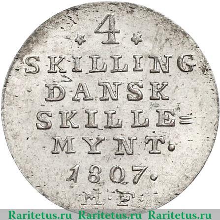 В центре надпись в 6 строк на датском языке: "4 SKILLING DANSK SKILLE MYNT 1807" - "4 ДАТСКИХ СКИЛЛИНГА МОНЕТНЫЙ ДВОР СКИЛЛЕ 1807".