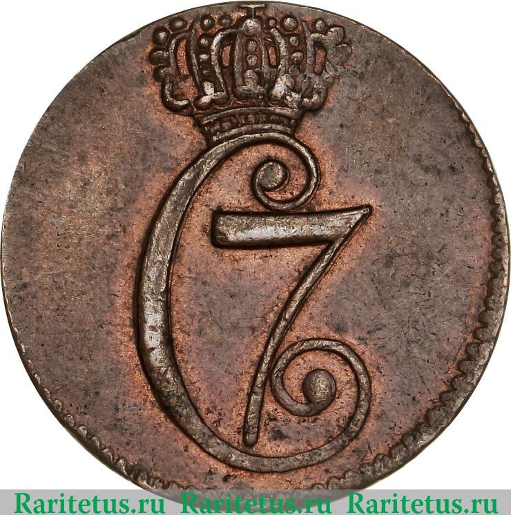 В центре монограмма короля Кристиана VII, над монограммой корона. По окружности канта декоративные элементы в виде зубцов.