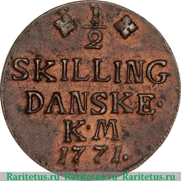 В центре надпись в пять строк на датском языке: «½ SKILLING DANSKE.K.M.» - половина скиллинга. По обеим сторонам числа «1/2» два четырехлепестковых цветка. Под надписью год выпуска 1771 с точкой.