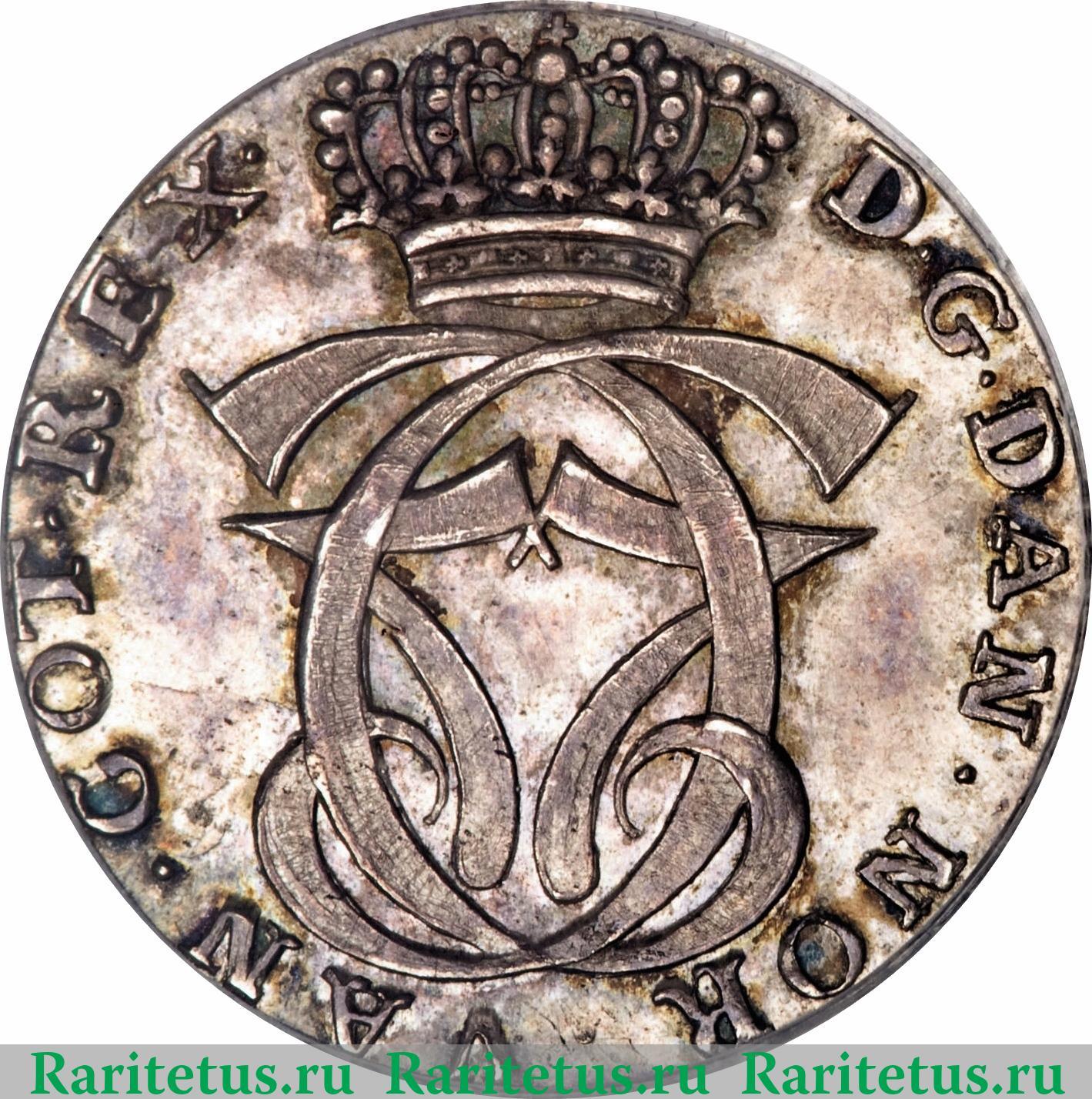 В центре изображена монограмма коронованного короля: сверху корона, под ней буква: "С" и цифра "7" слева направо и точно такая же в зеркальном отражении, что означает: "CHRISTIAN 7" - "КРИСТИАН VII". Справа, снизу и слева вдоль канта надпись на латинском языке: "D.G. DAN.NOR.VAN.GOT.REX" - "БОЖЬЕЙ МИЛОСТЬЮ КОРОЛЬ ДАНИИ, НОРВЕГИИ, ВЕНЕДОВ И ГОТЛАНДА".