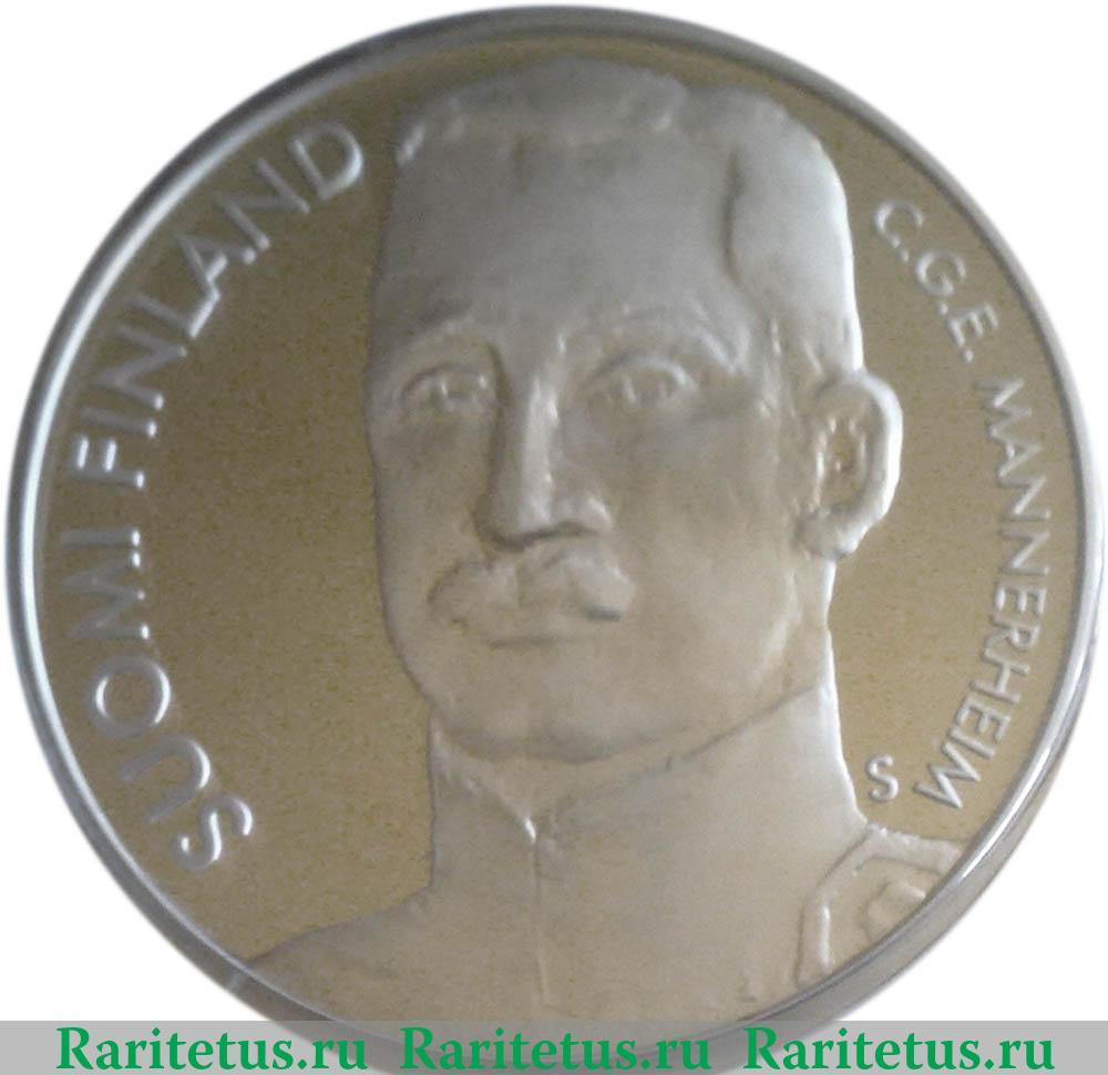 В центре фазовый портрет Карла Густава Эмиля Маннергейма. Слева вдоль канта название страны на финском и английском языках: «SUOMI FINLAND» - Финляндия, слева - надпись на финском языке: «C.G.E.MANNERHEIM» - Карл Густав Эмиль Маннергейм.