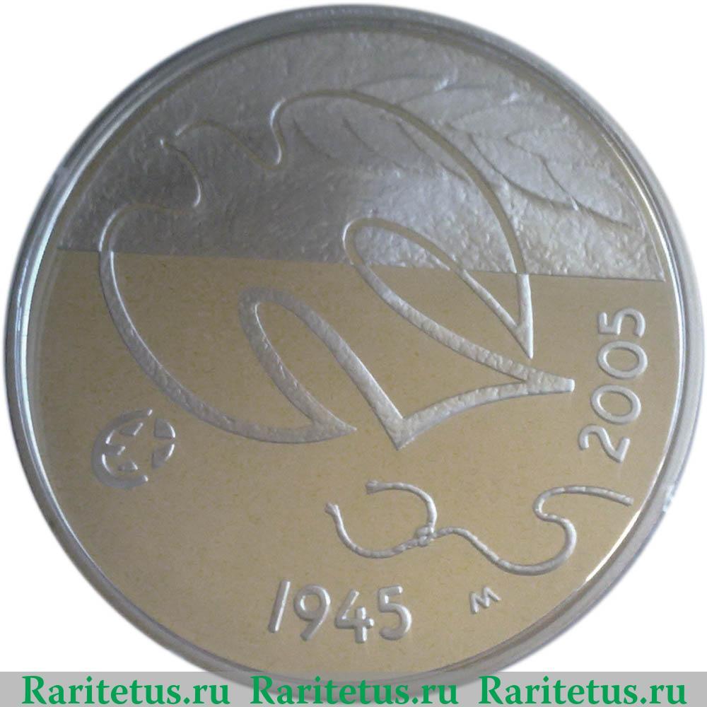 В центре стилизованный голубь мира. Под ним разорванное лассо и литера «М». Снизу и справа вдоль канта даты: «1945 - 2005», обозначающие год окончания второй мировой войны и год выпуска соответственно.