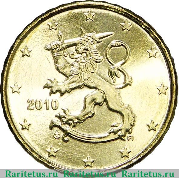 По центру изображен геральдический венценосный лев влево, стоит задними лапами на сабле, правая передняя лапа заменена на руку, которая держит занесенный меч. Под левой задней лапой латинские литеры государства эмитента «FI» (Финляндия), под рукоятью сабли стилизованный рог изобилия - знак монетного двора. Слева горизонтально год выпуска «2010». По окружности вдоль канта двенадцать пятиконечных звезд.
