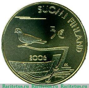 По центру изображен влево голубь, сидящий на руле лодки, снизу стилизовано, изображены волны. Справа от птицы надпись «5 €» (5 Евро). Над бортом лодки год выпуска «2006». Вдоль канта название страны «Финляндия» на двух языках: сверху на финском «SUOMI», справа на шведском «FINLAND». Над пером руля латинская литера «M» - знак художника Pertti Kalervo Mäkinen.