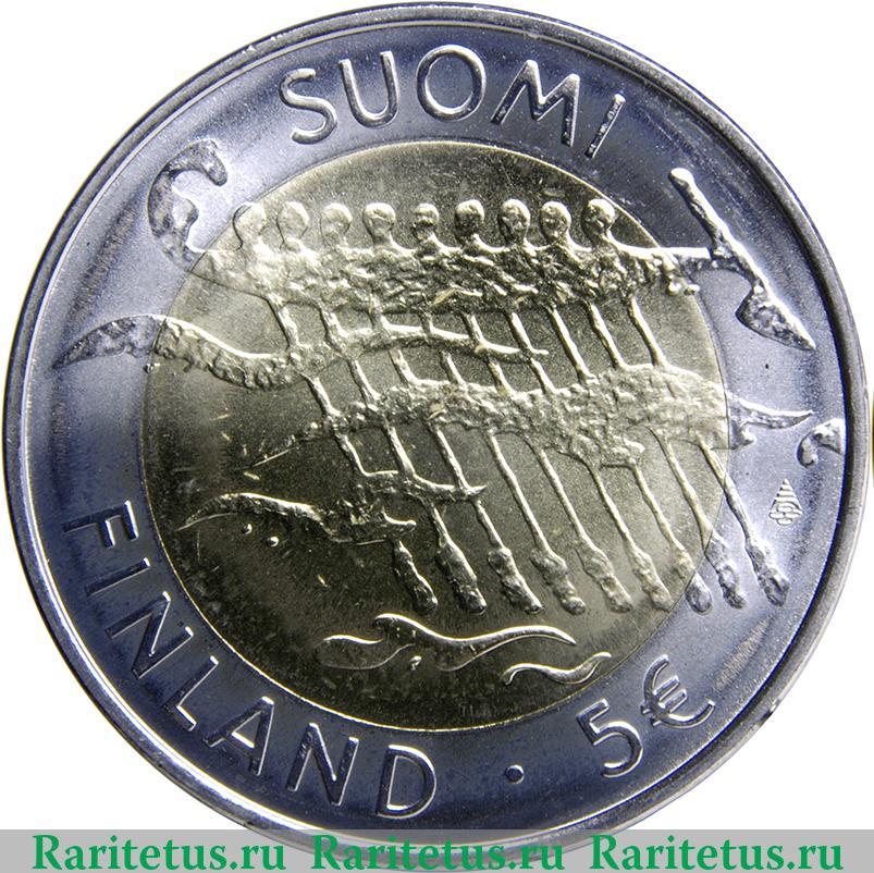 По центру на внутреннем диске стилизованное изображение: весельное судно, с девятью гребцами, весла опущены в волны. Сверху название страны «Финляндия» на финском языке «SUOMI», снизу на шведском «FINLAND»и надпись «5 €» (5 Евро). Справа у канта знак монетного двора - стилизованный рог изобилия.