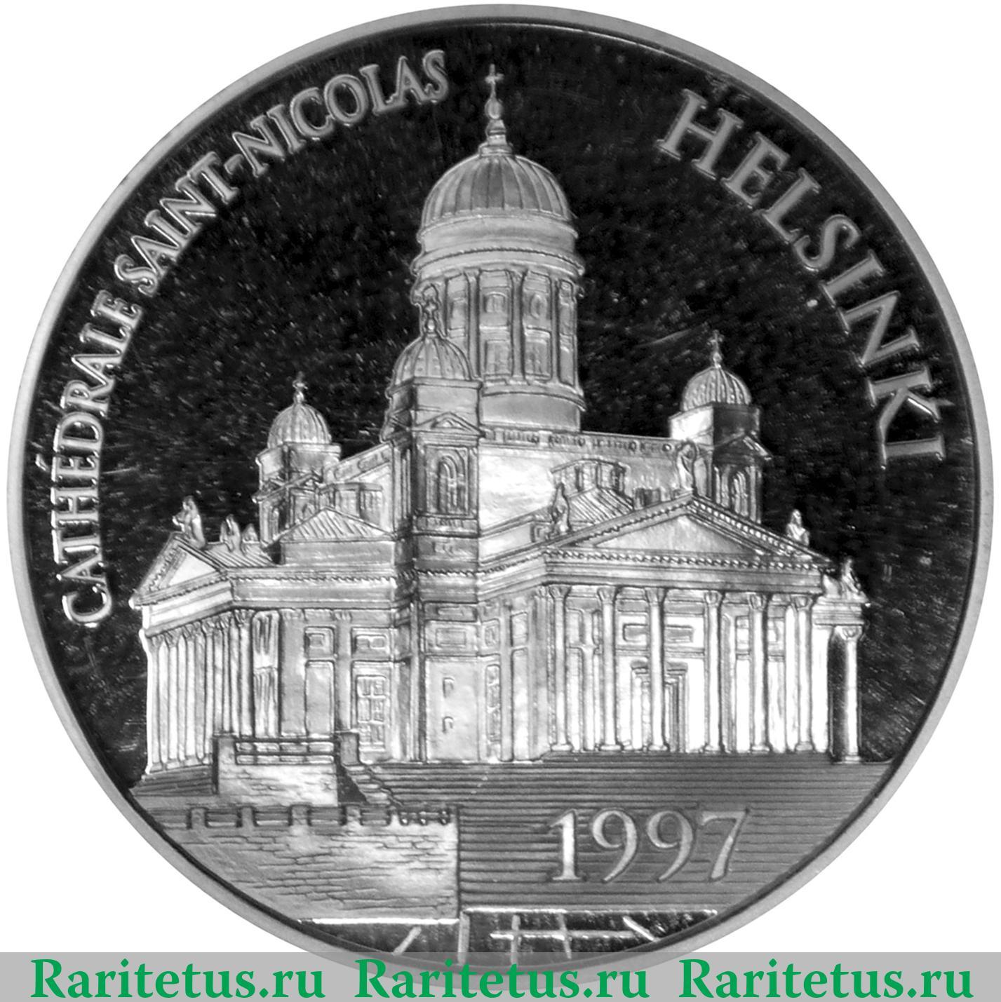 В центре изображение собора Святого Николая, расположенного в Хельсинки. Финляндия. Слева, сверху и справа вдоль канта его название и город на французском языке: "CATHEDRALE SAINT-NICOLAS HELSINKI". Снизу - год выпуска: "1997".