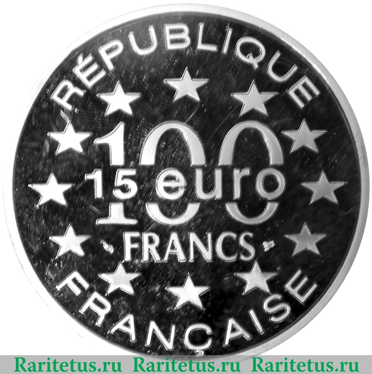 В центре надпись 15 евро: "15 EURO" на фоне надписи 100 франков: "100 FRANCS". По окружности изображено 12 пятиконечных звёзд. Сверху и снизу вдоль канта надпись Французская Республика на франц. яз.: "RÉPUBLIQUE FRANÇAISE".