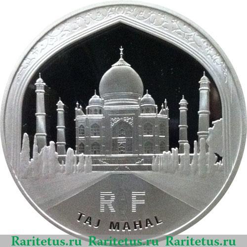 В центре изображён мавзолей-мечеть Тадж-Махал. Снизу - его название на франц яз.: "TAJ MAHAL" и обозначение Французской Республики: "RF".