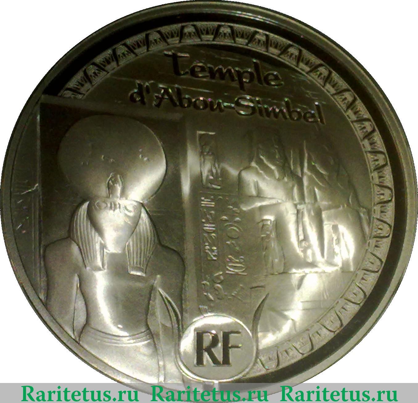 В центре изображён вход в Большой храм Абу-Симбела. Сверху надпись в две строки на французском языке «Temple d`Abou-Simbel», переводится как «Храм Абу-Симбел». Снизу символы «RF» — знак Франции на монетах Евросоюза.