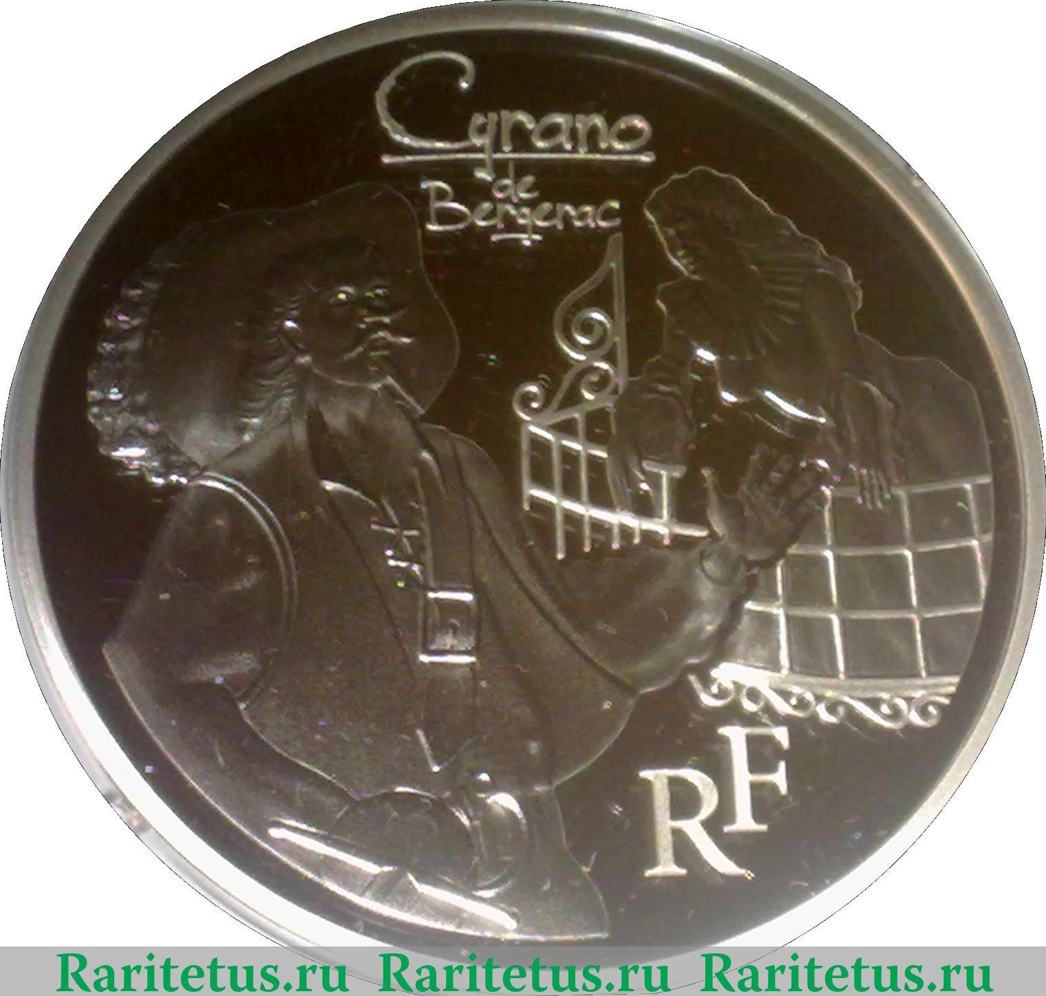 Коллекционная серебряная монета. Серия: Легендарные персонажи из французской литературы - Сирано де Бержерак. Посвящена известному герою одноименной пьесы Эдмона Ростана.