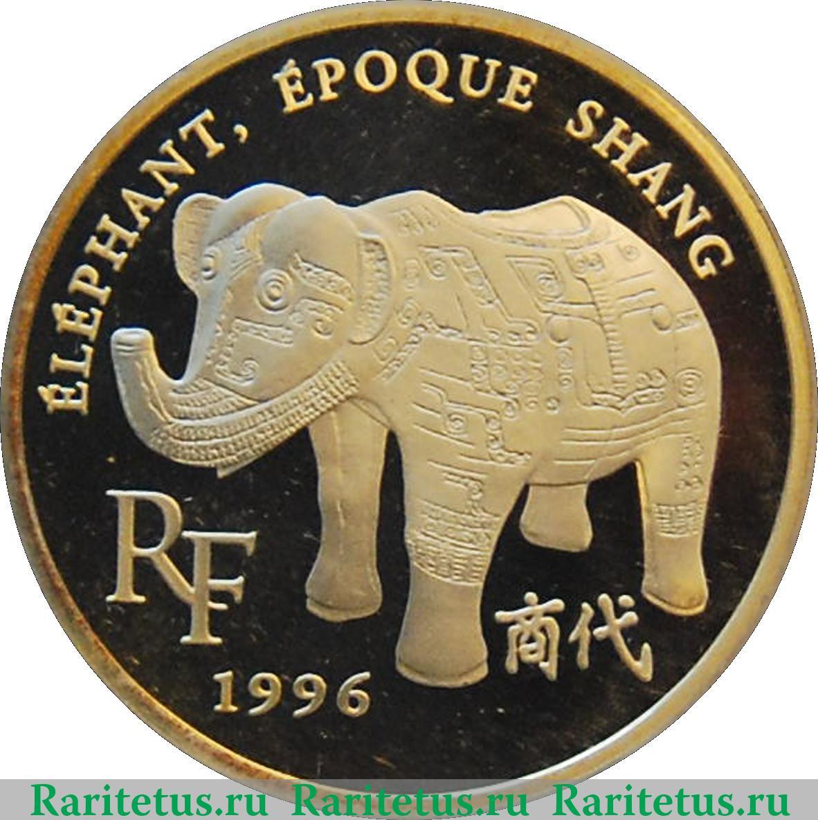 В центре изображён слон. Слева в 2 строки сокращённое обозначение Франции: "RF" и год выпуска: "1996". Сверхувдоль канта надпись на французском языке: "ÉLÉPHANT ÉPOQUE SHANG" - "СЛОН ЭПОХИ ШАН", снизу - на китайском: "商代" - "ДИНАСТИЯ ШАН".