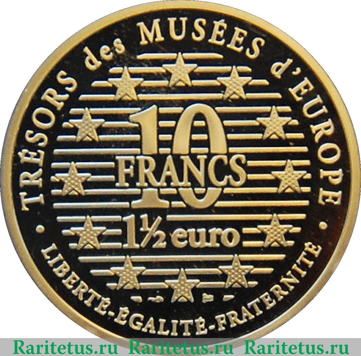 В центре - надпись в 2 строки: "10 FRANCS" - "10 ФРАНКОВ" и "1 1/2 euro" - "1 1/2 евро". Вдоль канта надписи на французском языке, сверху: "TRÉSORS des MUSÉES d'EUROPE" - "СОКРОВИЩА МУЗЕЕВ ЕВРОПЫ", снизу - девиз страны: "LIBERTÉ-ÉGALITÉ-FRATERNITÉ" - "СВОБОДА РАВЕНСТВО БРАТСТВО".