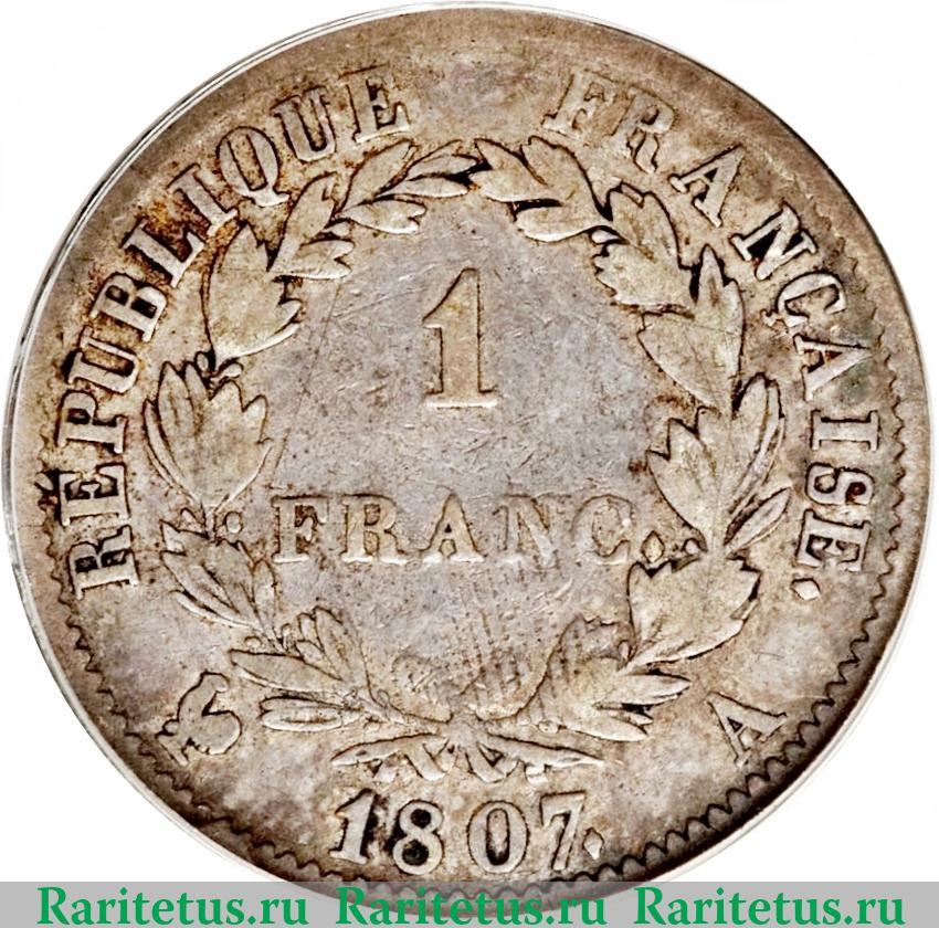 В центре, в венке из листьев, надпись на франц.яз.: «1 FRANC.» - 1 франк. Слева, сверху и справа вдоль канта название страны на французском языке: «REPUBLIQUE FRANÇAISE.» - Республика Франция, снизу год выпуска: 1807, обрамлённый литерами Парижского монетного двора: петухом и литерой «А». Вдоль канта - зубчатый рельеф.