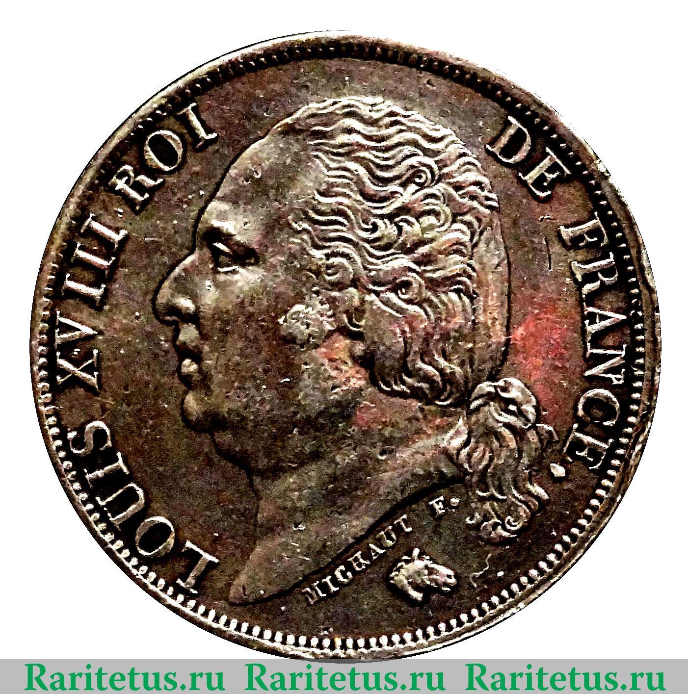 В центре профильный портрет влево Людовика XVIII. В обрезе шеи литера «MICHAUT.F.» - знак художника Огюста-Франсуа Михо. Слева, сверху и справа вдоль канта надпись на латинском языке: «LOUIS XVIII ROI DE FRANCE.» - Людовик XVIII король Франции. По окружности канта рельефные элементы, выполненные в виде зубцов.