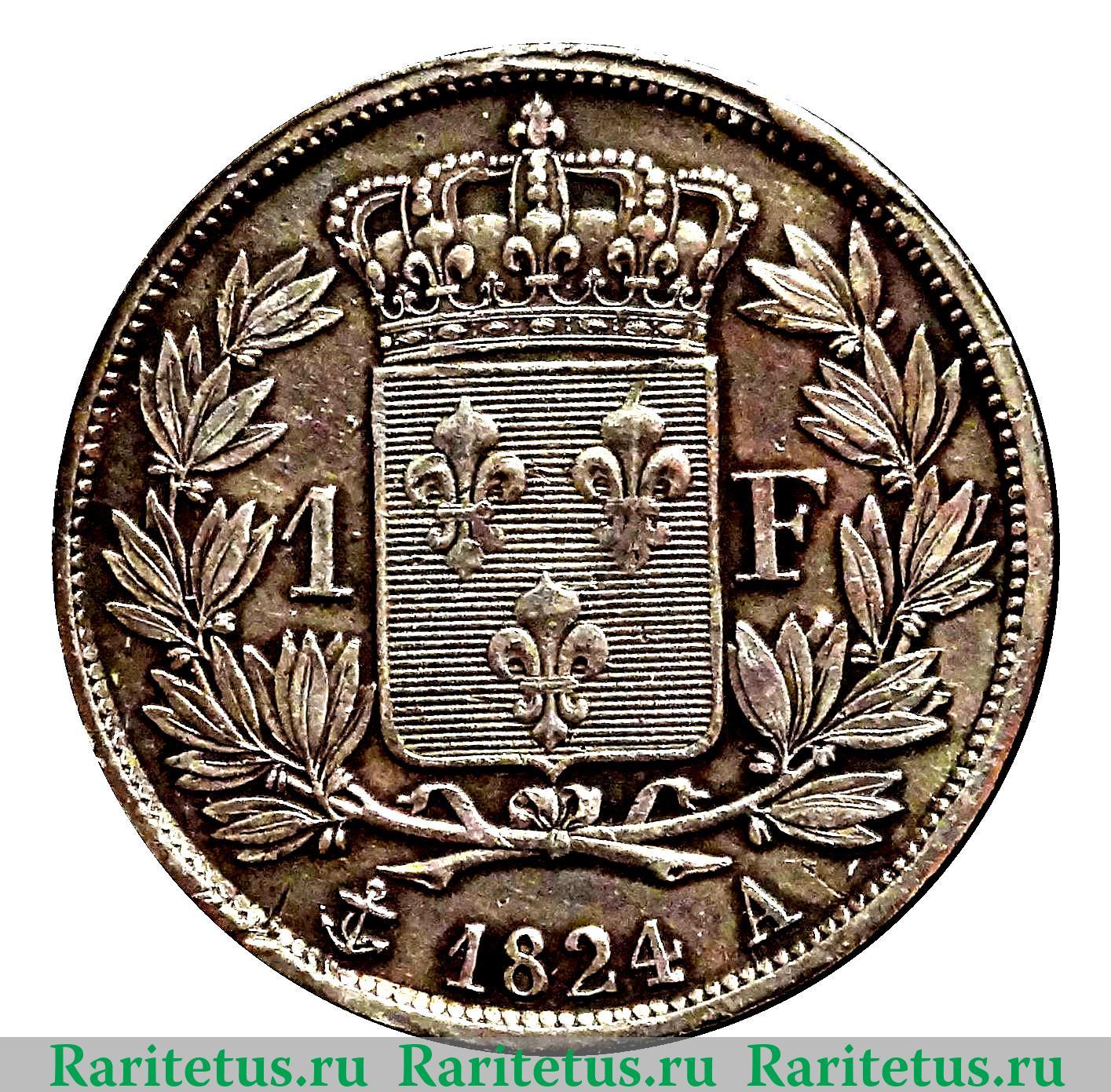В центре, в венке из листьев герб Франции. Слева и справа от него надпись на французском языке: 1 F - 1 франк. Под ним год выпуска: 1824, обрамлённый литерами: якорем и литерой «А» - знаками Парижского монетного двора. Вдоль канта - зубчатый рельеф.