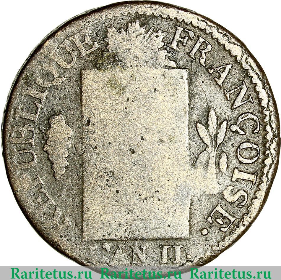 В центре на развёрнутом вертикально листе надпись «LES HOMMES SONT EGAUX LA LOI», в переводе с фр. яз. «Все равны перед законом». Сверху над листом «сияет» всевидящее око, слева расположена кисть винограда, справа — пять связанных колосьев, снизу дата по революционному календарю «L’AN II.», соответствует 1793 году.