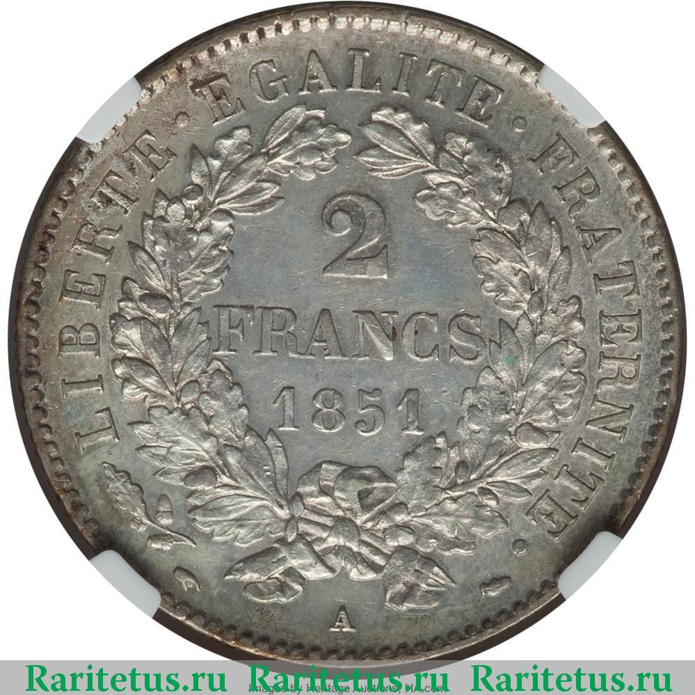 Реверс монеты 2 франка (francs) 1851 года Франция