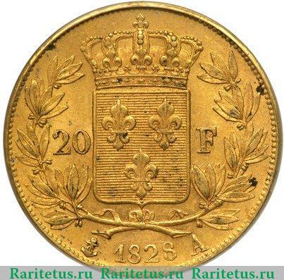 В центре, в венке из листьев герб Франции. Слева и справа от него надпись на французском языке: «20 F» - 20 франков. Под ним год выпуска: 1828, обрамлённый литерами Парижского монетного двора: якорем и литерой «A». Вдоль канта - зубчатый рельеф.