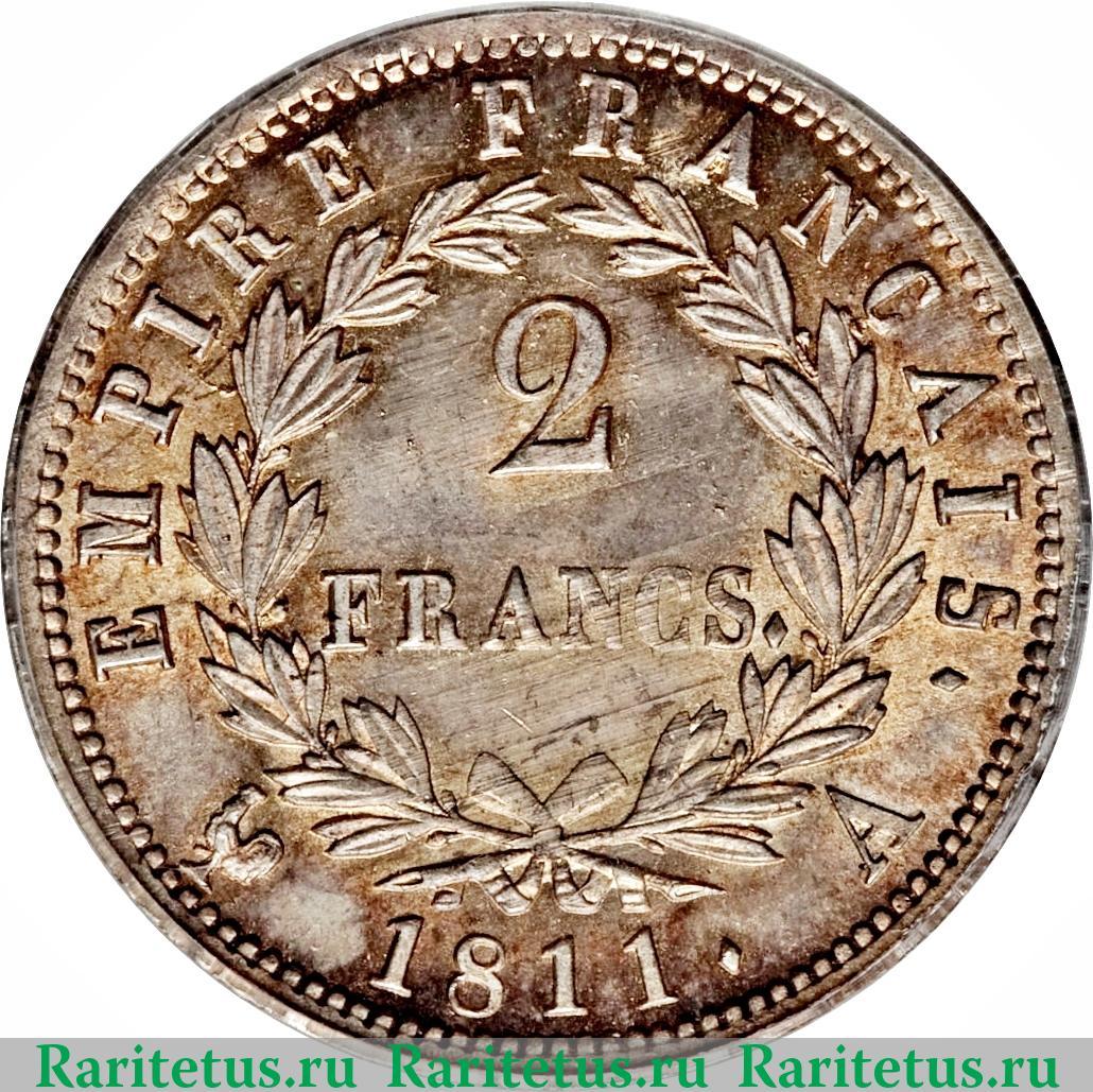 В центре, в венке из листьев, надпись на франц.яз.: «2 FRANCS.» - 2 франка. Слева, сверху и справа вдоль канта название страны на франц. яз.: «EMPIRE FRANÇAISE.» - Французская Империя, снизу год выпуска: 1811, обрамлённый литерами Парижского монетного двора: петухом и литерой «А». Вдоль канта - зубчатый рельеф.