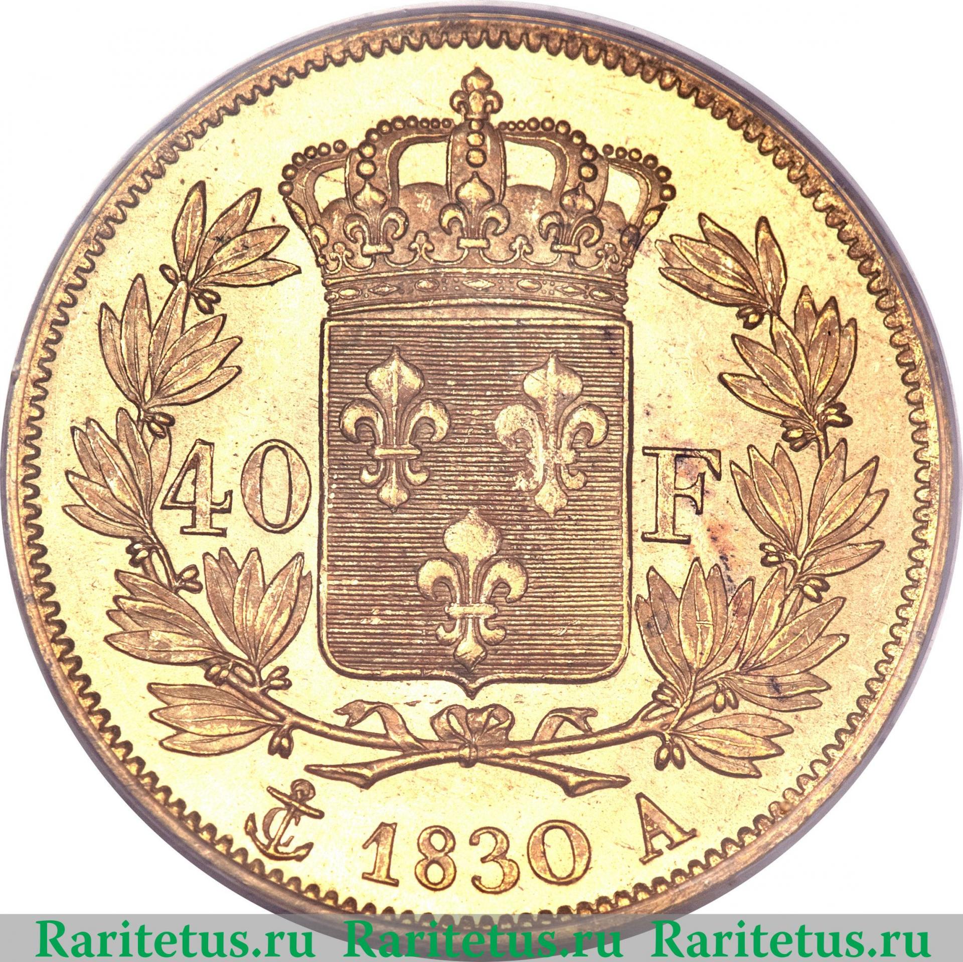 В центре, в венке из листьев герб Франции. Слева и справа от него надпись на французском языке: «40 F» - 40 франков. Под ним год выпуска: 1830, обрамлённый литерами Парижского монетного двора: якорем и литерой «A». Вдоль канта - зубчатый рельеф.