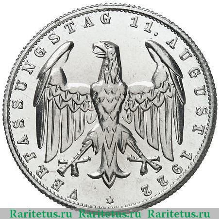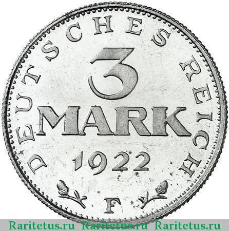 Аверс монеты 3 марки (mark) 1922 года F Германия
