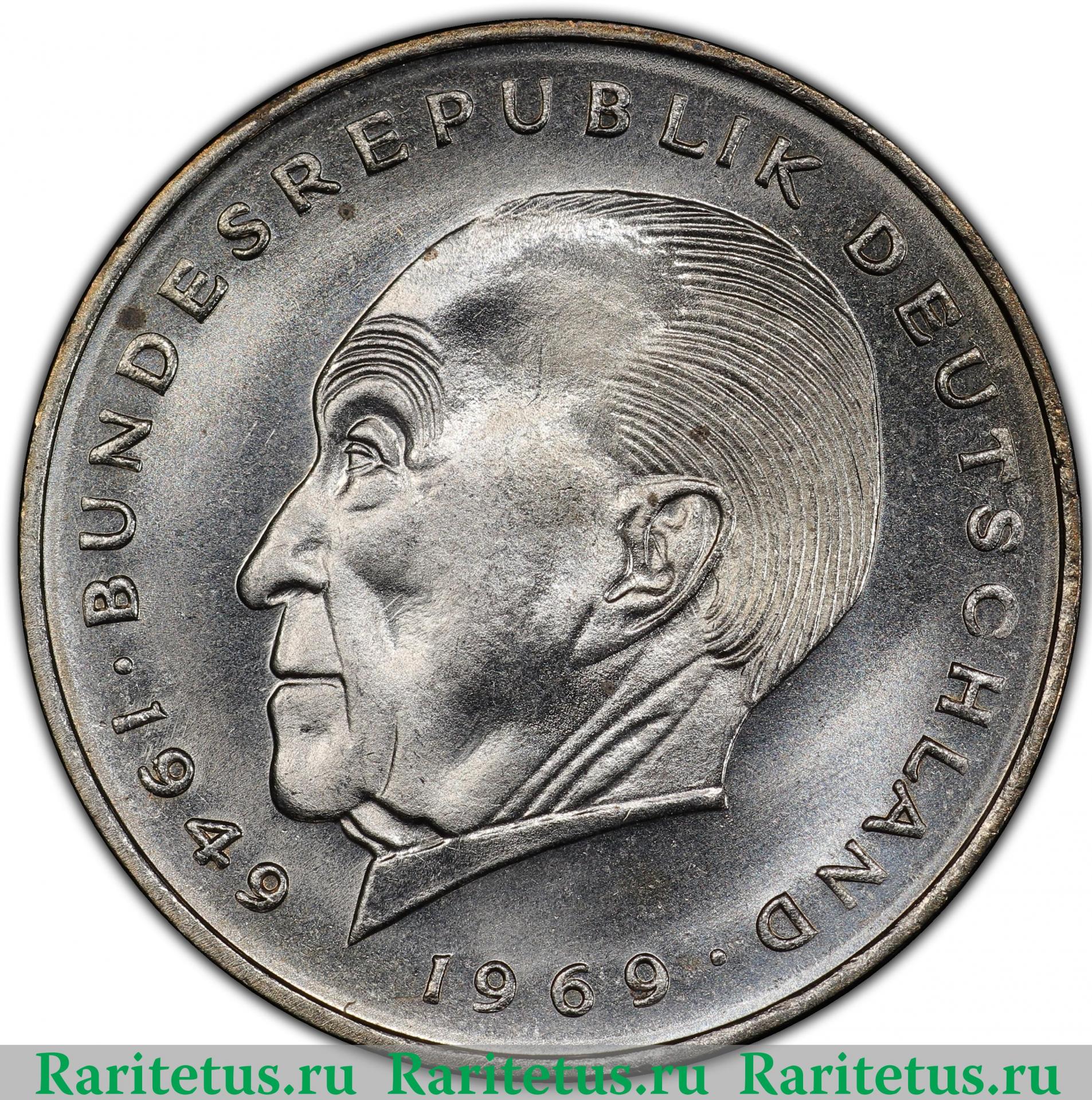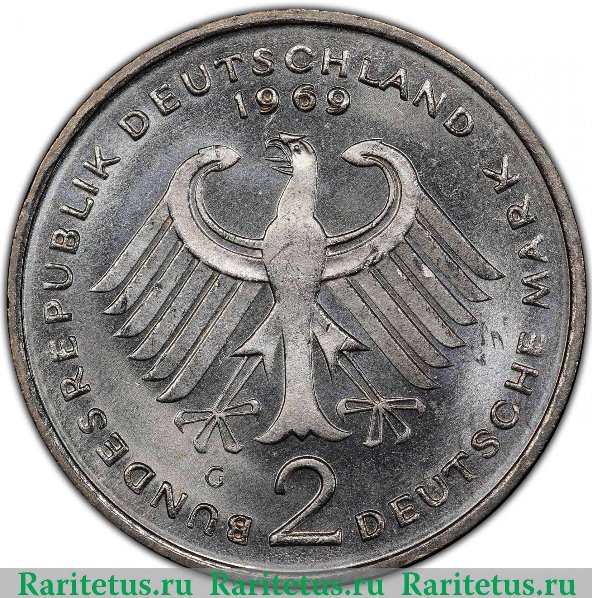 Аверс монеты 2 марки (deutsche mark) 1969 года G Германия