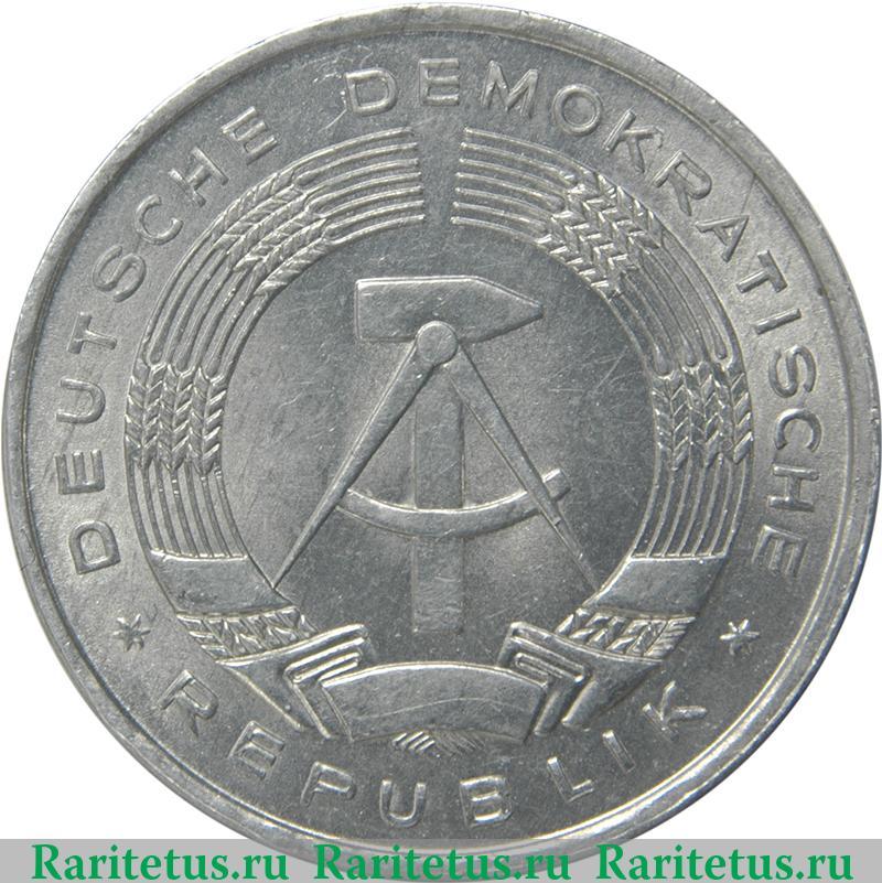 Вдоль канта надпись на немецком языке: "DEUTSCHE DEMOKRATISCHE REPUBLIK" - "ГЕРМАНСКАЯ ДЕМОКРАТИЧЕСКАЯ РЕСПУБЛИКА". В центре изображён герб страны - внутри венка из пшеничных колосков молот и циркуль.