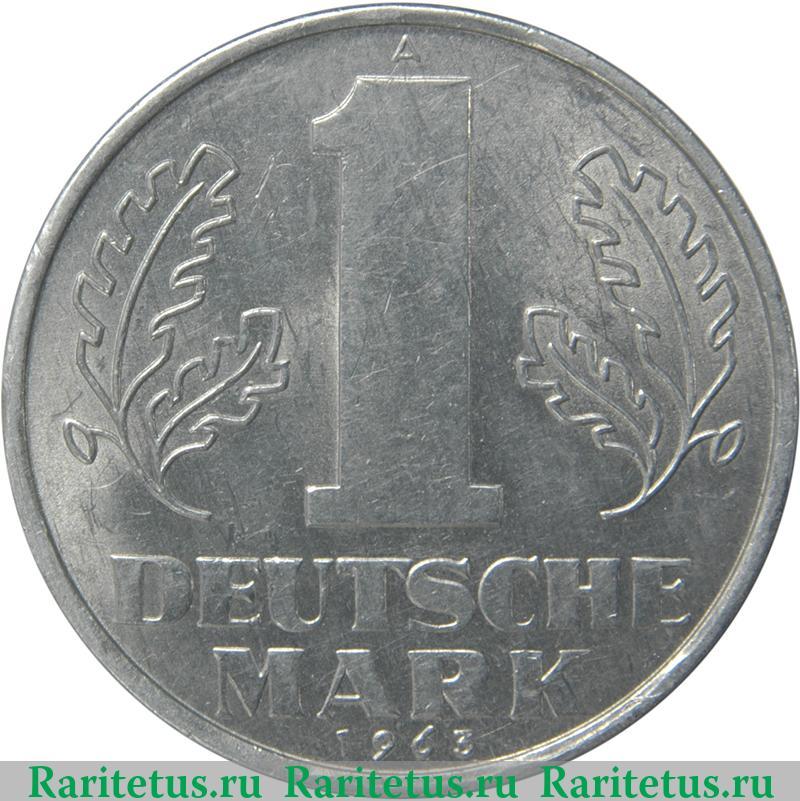 В центре в 3 строки надпись на немецком языке: "1 DEUTSCHE MARK" - "1 НЕМЕЦКАЯ МАРКА". Снизу - год выпуска: "1963". Слева и справа изображены 2 дубовых листа.