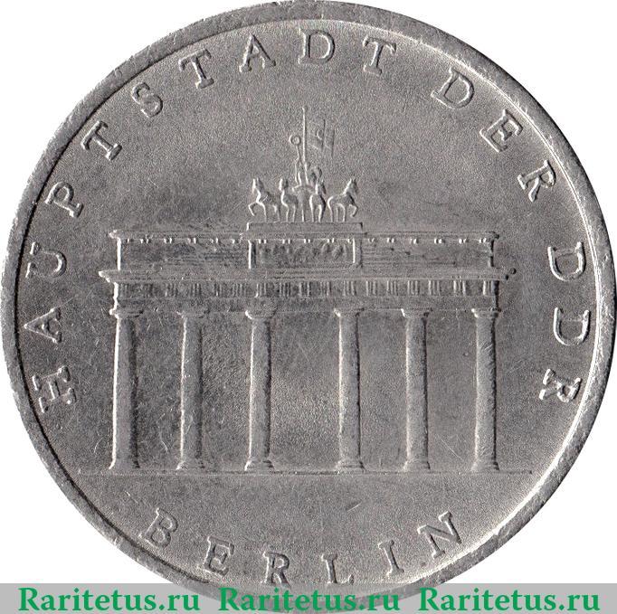 В центре изображены Бранденбургские ворота. Вдоль канта надписи на немецком языке, слева, сверху и справа: "HAUPTSTADT DER DDR" - "СТОЛИЦА ГДР", снизу: "BERLIN".