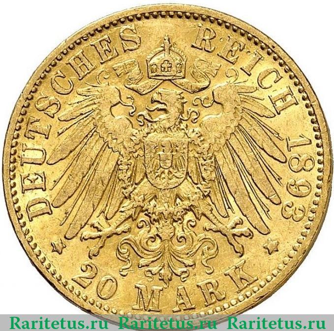 Реверс монеты 20 марок (mark) 1893 года Германия (Империя)