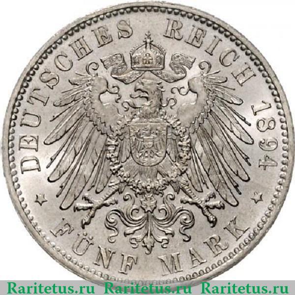 Реверс монеты 5 марок (mark) 1894 года Германия