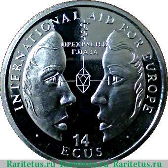 В центре изображены 2 лица, обращённые друг на друга. Между ними - посох Асклепия и надпись на русском языке: "ПРЕКРАСНЫЕ ГЛАЗА". Вдоль канта надп. на английском языке, сверху: "INTERNATIONAL AID FOR EUROPE" - "МЕЖДУНАРОДНАЯ ПОМОЩЬ ЕВРОПЫ", снизу в 2 строки: "14 ECUS" - "14 ЭКЮ".