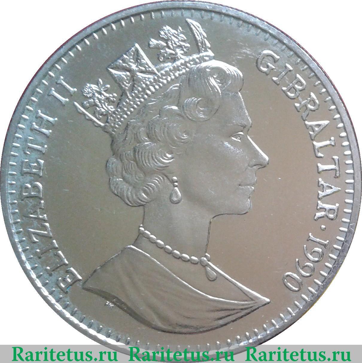 В центре, в точечном круге, профильный портрет вправо королевы Великобритании и Северной Ирландии Елизаветы II. В обрезе шеи литера «PM» - знак монетного двора Великобритании «Pobjoy Mint» г. Тэдворс. Слева вдоль канта надпись на английском языке: «ELIZABETH II» - Елизавета II, справа - название страны и год выпуска: «GIBRALTAR 1990» - Гибралтар 1990. По окружности канта расположены рельефные элементы, выполненные в виде зубцов.