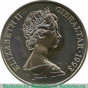 В центре профильный портрет вправо королевы Великобритании и Северной Ирландии Елизаветы II. В обрезе шеи литера «PM» - знак монетного двора Великобритании «Pobjoy Mint» г. Тэдворс. Слева вдоль канта надпись на английском языке: «ELIZABETH II» - Елизавета II, справа - название страны и год выпуска: «GIBRALTAR 1993» - Гибралтар 1993.