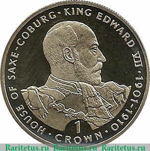 В центре профильный портрет вправо Эдуарда VII. Под ним надпись на англ.яз. в две строки: «1 CROWN» - 1 крона. Слева, сверху и справа вдоль канта надпись на анг.яз.: «HOUSE OF SAXE-COBURG KING EDWARD VII 1901 - 1910» - Саксен-Кобургская династия, король Эдуард VII, 1901 - 1910.