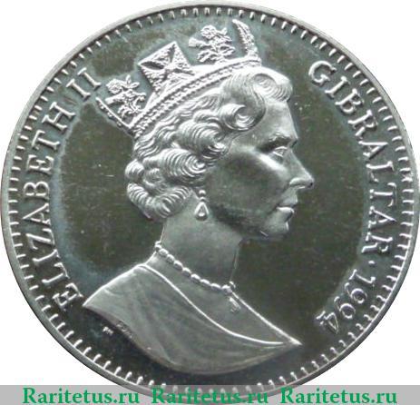 В центре профильный портрет вправо королевы Великобритании и Северной Ирландии Елизаветы II. В обрезе шеи литера «PM» - знак монетного двора Великобритании «Pobjoy Mint» г. Тэдворс. Слева вдоль канта надпись на английском языке: «ELIZABETH II» - Елизавета II, справа - название страны и год выпуска: «GIBRALTAR 1994» - Гибралтар 1994. По окружности канта рельефные элементы, выполненные в виде зубцов.