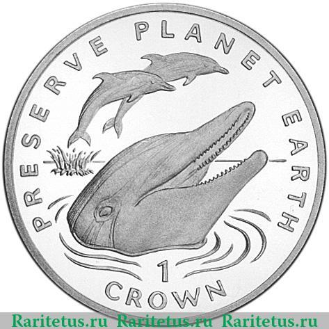 В центре композиция: изображение трёх дельфинов, играющих в воде. Под ним надпись на англ.яз. в две строки: «1 CROWN» - 1 крона. Слева, сверху и справа вдоль канта надпись на анг.яз.: «PRESERVE PLANET EARTH» - заповедник планета Земля.