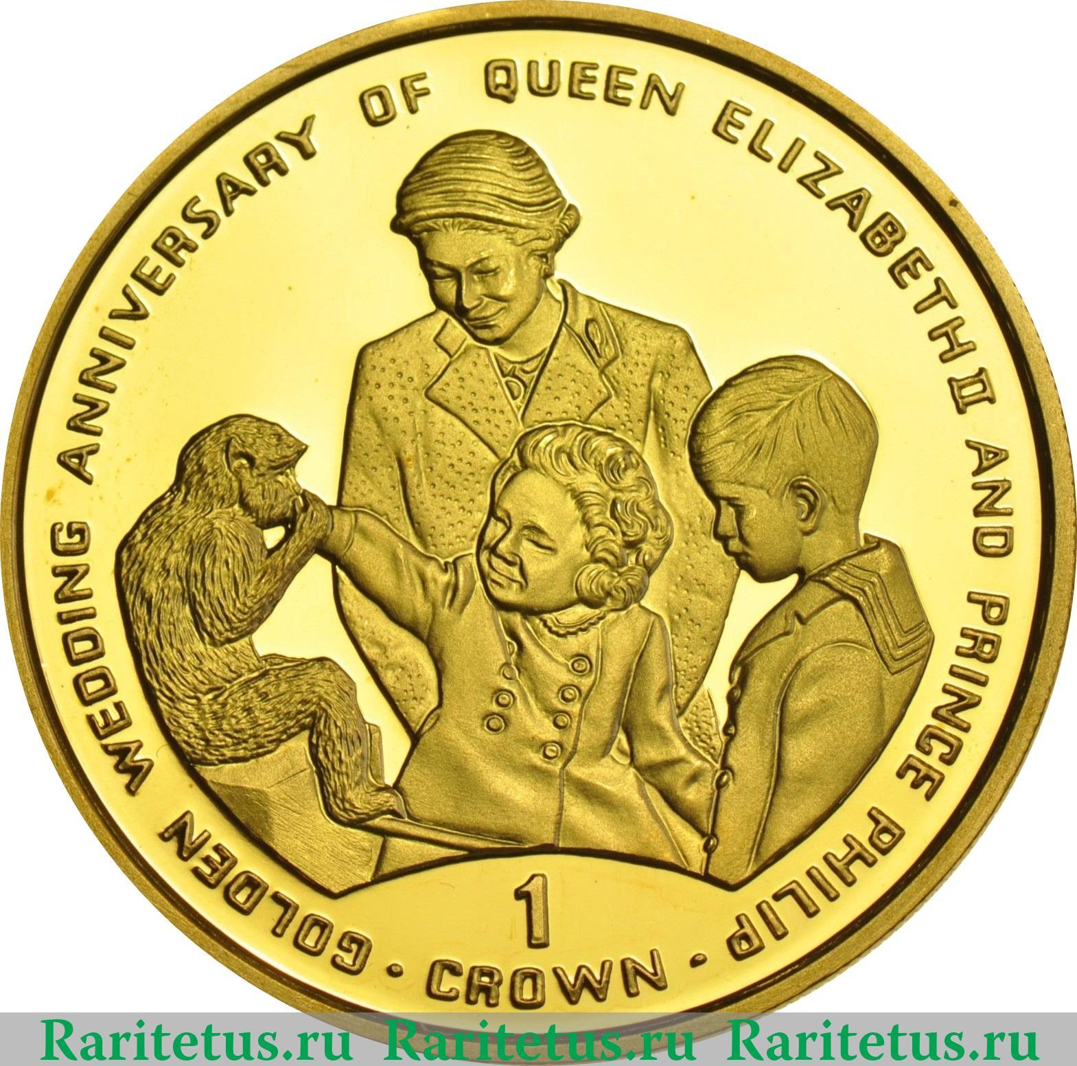 В центре изображение женщины, стоящей рядом с мальчиком, девочкой и обезьяной. Вдоль канта надписи на английском языке - слева, сверху и справа: "GOLDEN WEDDING ANNIVERSARY OF QUEEN ELIZABETH II AND PRINCE PHILIPP" - "ГОДОВЩИНА ЗОЛОТОЙ СВАДЬБЫ КОРОЛЕВЫ ЕЛИЗАВЕТЫ II И ПРИНЦА ФИЛИППА", снизу в 2 строки: 1 CROWN" - "1 КРОНА".
