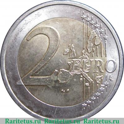 В центре слева большая цифра 2, справа от неё надпись на англ. яз. «EURO» – переводится как «2 евро». Под буквой «O» – знак гравера Люка Люйкса «LL». Надпись размещена на фоне контуров карты Европы. От них вверх и вниз расходится по шесть вертикальных параллельных прямых линий, на концах которых 12 звёзд.