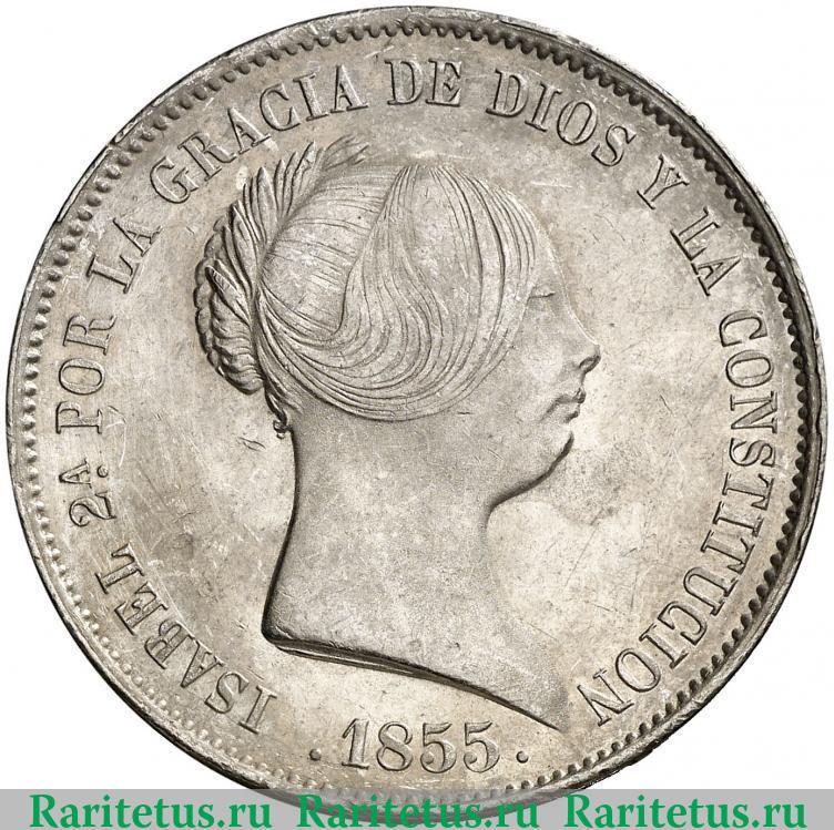 Цена на монету 20 реалов (reales, дуро) 1855 года 6-и конечная звезда на сегодня, 6 октября 2025 года