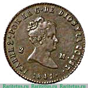 Аверс монеты 2 мараведи 1836-1858 годов Испания